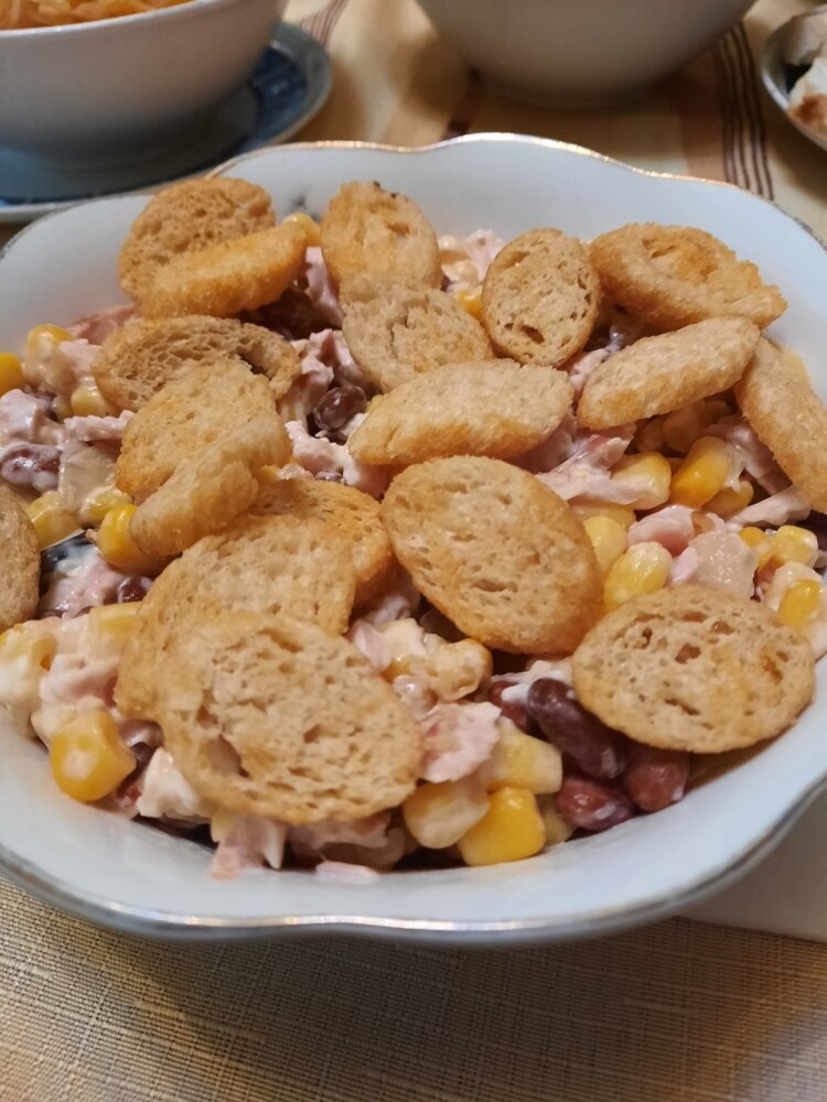 Чтобы собрать салат нам понадобится: 2 копченых куриных окорочка, 1 банка кукурузы и 1 банка красной фасоли в собственном соку, 1 небольшая луковица, Майонез для заправки и сухарики. Куриные окорочка освободить от костей, порезать кусочками. Выложить в дуршлаг кукурузу и фасоль, чтобы стекла жидкость. Соединить с курицей. Лук мелко порезать и слегка обжарить в растительном масле. Добавить в салатник, все перемешать. Заправить майонезом, посыпать сухариками. Мне было вкусненько, попробуйте, может быть и вам понравится!