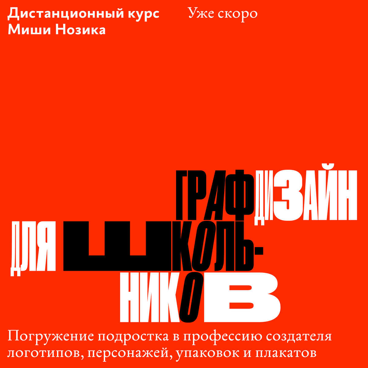 Миша Нозик подготовил наш первый курс для детей и подростков: «Графический дизайн для школьников». Курс будет длиться три недели и пройдёт в дистанционном формате. Запись скоро откроется. Работа графического дизайнера требуется повсюду: на упаковках хлопьев для завтрака, на вывесках магазинов игрушек, в книжках с картинками. Даже знак «Стоп» и кран в ванной были созданы при участии графического дизайнера. Задача курса — показать, как всё вокруг нас связано с графическим дизайном и вдохновить попробовать себя в этой профессии. Из описания курса: «На курсе для детей и подростков рассказывается о том, что такое графический дизайн, как собрать крепкую композицию на листе или экране, зачем нужен логотип и серия знаков, как влиять на эмоции людей и откуда берётся красота в дизайне. Участники пробуют себя на практике в роли графдизайнера, играют с логотипами, шрифтами и композицией. Каждую неделю участники получают доступ к видеолекциям в учебном кабинете для самостоятельного изучения. А на е