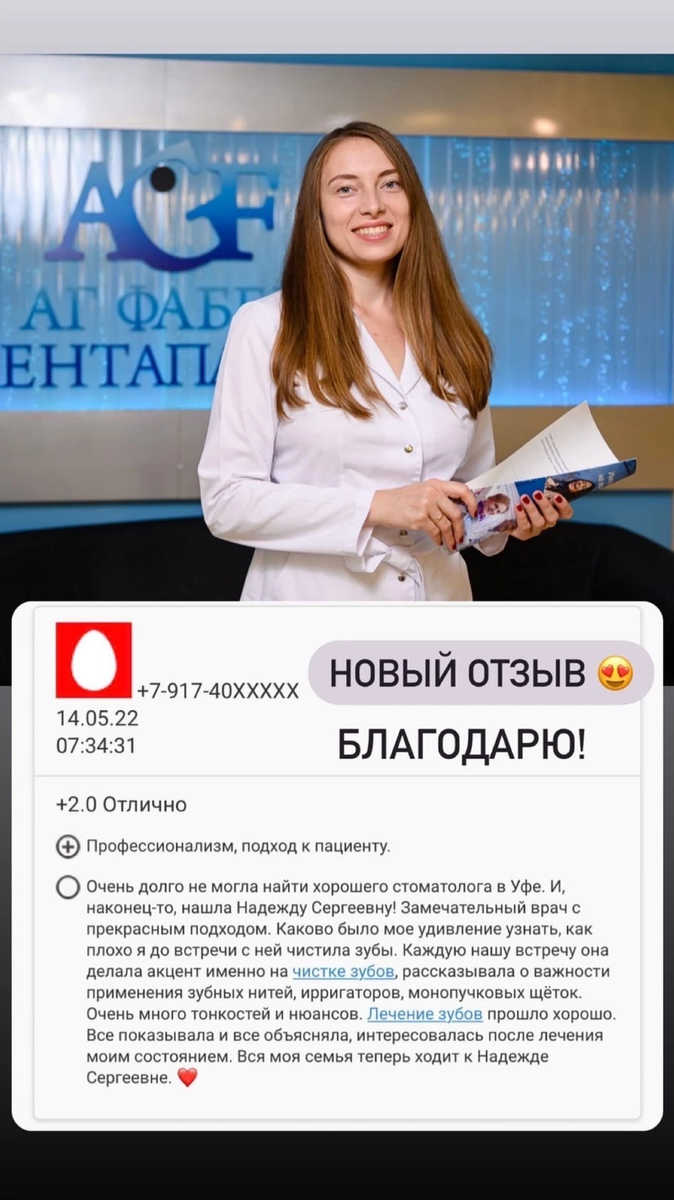 Ваш доктор - Надежда Сергеевна Кузнецова, заведующая лечебно-профилактическим отделением клиники AG Faber в Уфе, кандидат медицинских наук, стоматолог-терапевт, автор 30 научных работ. P.S. Вы можете записаться ко мне на очную консультацию по состоянию здоровья полости рта в Уфе, в клинику AG Faber Дентаплант. Также я провожу консультации по пародонтиту онлайн — запись через сообщения сообщества.