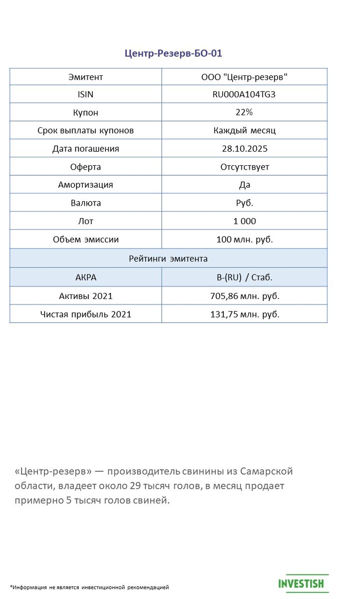 В мае мы удивили первые размещения. Это были облигации надежных эмитентов – МТС, РЖД, Ростелеком. И вот теперь первый выпуск из сегмента ВДО – Центр-Резерв. «Центр-резерв» — крупный производитель свинины, который находится в Самарской области. В 2020г. произвел 6,5 тыс. тонн свинины. 17.02 «Центр-резерв» разместили облигации с купоном 22%. Облигации будут обращаться до 28.10.2025. На мой взгляд, инвестиции на рынке ВДО по прежнему несут серьезные риски. Однако по мере снижения доходностей, новых размещений может быть больше, а риски будут существенно сокращаться. Так