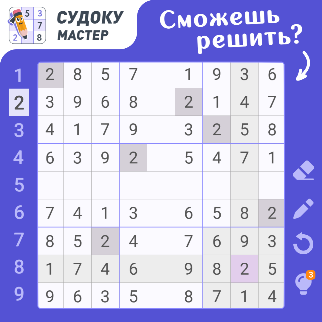 Готовы к новым свершениям в стезе "Судоку"? Тогда предлагаем решить такую задачку. Достаточно просто, не правда ли? Если справились, предлагаем продолжить.
