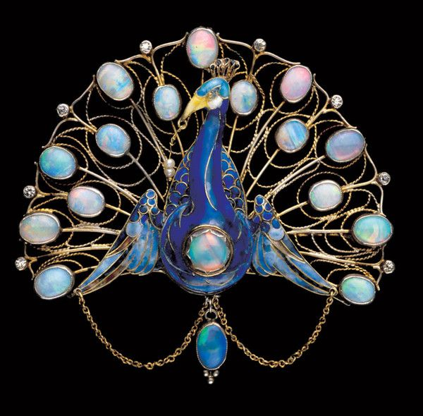 Рене Лалик, парижский ювелир, создал удивительно замысловатые украшения из эмали и золота, которые оказались идеальными материалами для причудливых творений в виде павлинов, таких как подвески, кольца и броши. Яркие и яркие эмали и золотая оправа отражали искрящуюся и контрастную смесь самого павлина, а любимы камни ювелиров той эпохи - опалы дополняли украшения.