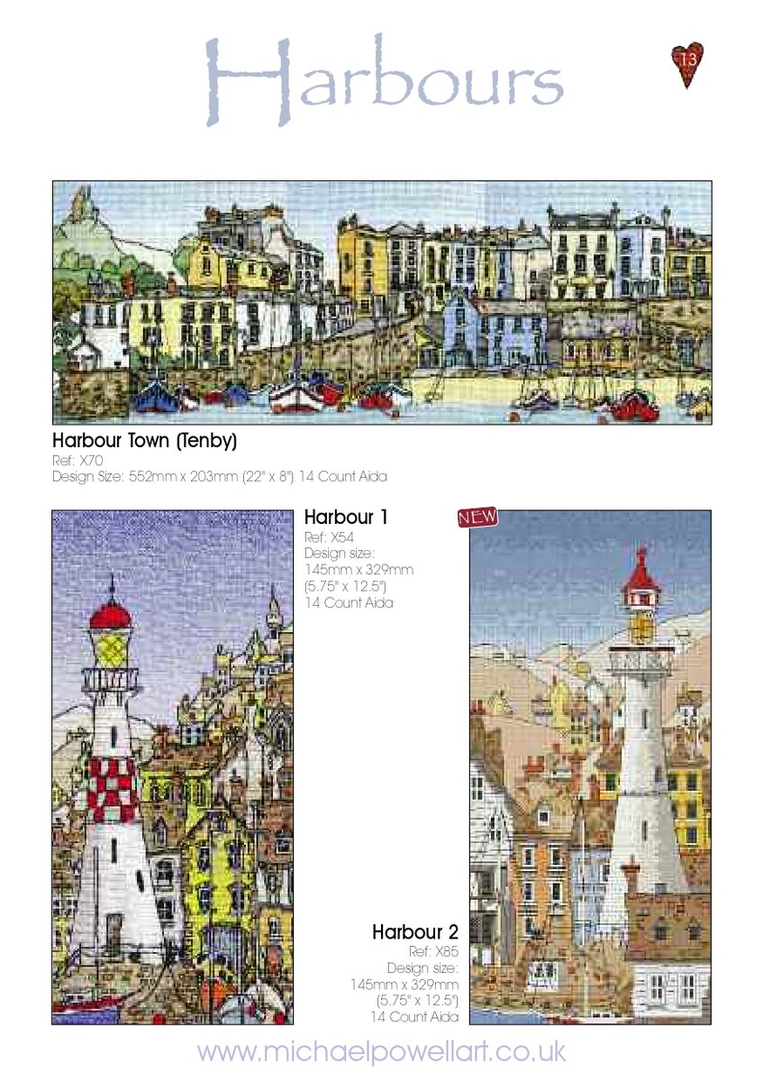 Продолжаем листать каталог вышивок от великолепного английского дизайнера Майкла Пауэлла (Michael Powell). Первую часть каталога мы изучали по ссылке. Знакомство начиналось с небольших дизайнов, теперь же мы переходим к более масштабным вышивкам. 1. Пожалуй, это мои любимые дизайны Майкла Пауэлла. Обожаю морскую тематику и к маякам в вышивке отношусь с большой симпатией. 2. Триптих "Венеция" очень хорош. В буклете изображен вариант с вышивкой трех элементов одним большим дизайном, но мне нравится именно идея с вышивкой трех вертикальных панелек. 3. Еще два замечательных триптиха посвящены Испании и Тоскане. В них уже выделяется размерами центральный дизайн, а два боковых элемента его дополняют. Кстати, по сути дизайны можно вышивать и отдельно, они сами по себе являются законченными композициями. Есть и дизайн из пяти вертикальных панелек - дома Прованса. Но мне он нравится поменьше. Я больше люблю когда есть ярковыраженный центральный элемент. 4. Мы плавно перемещаемся в зиму. У д