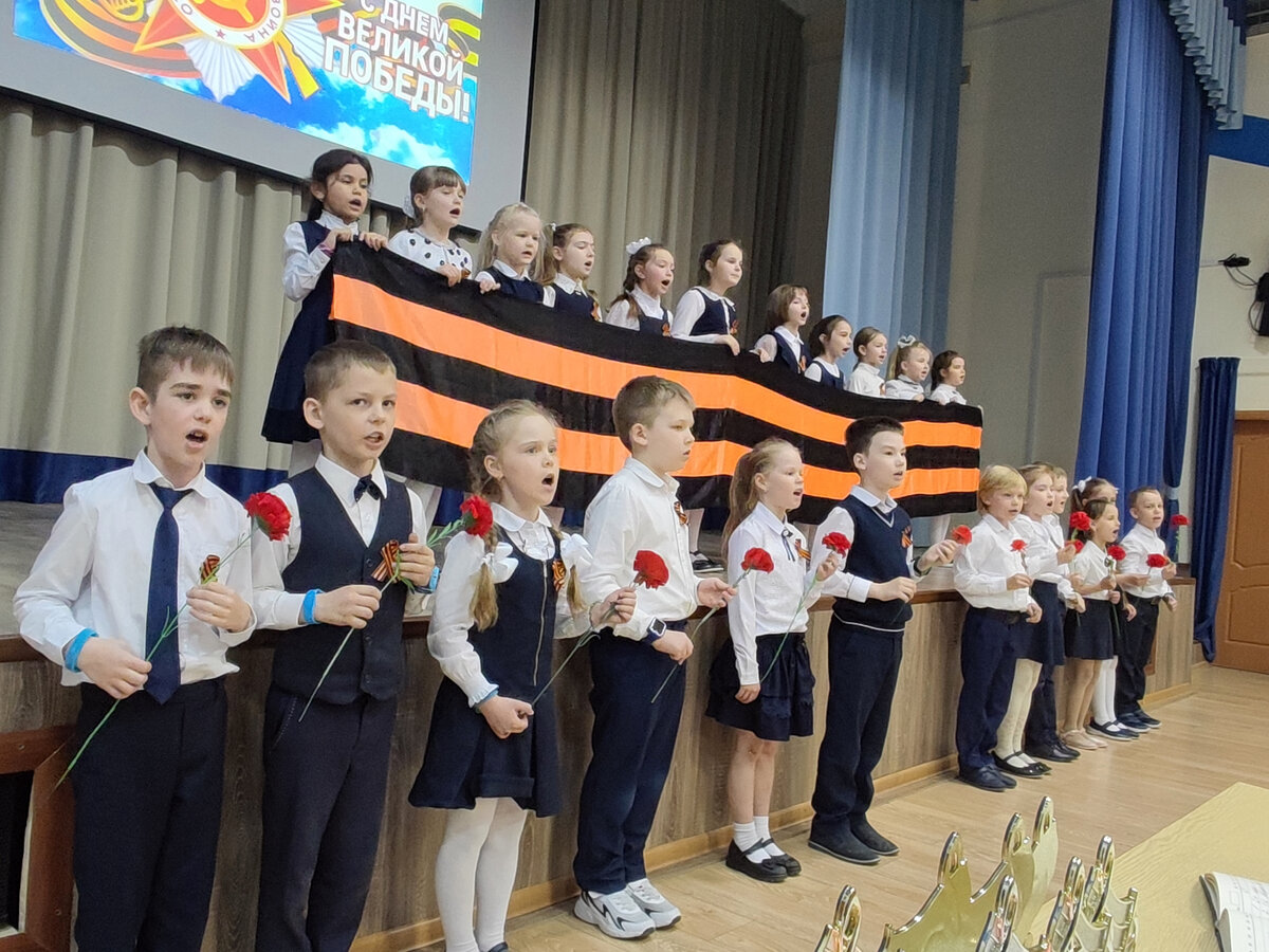 Ученики 4-х классов исполнили песни "Бессмертный полк", "Катюша", "Вперёд, Россия!", "Спасибо", "А мы войны не знали", "Прадедушка", "Идёт солдат по городу" 🪖