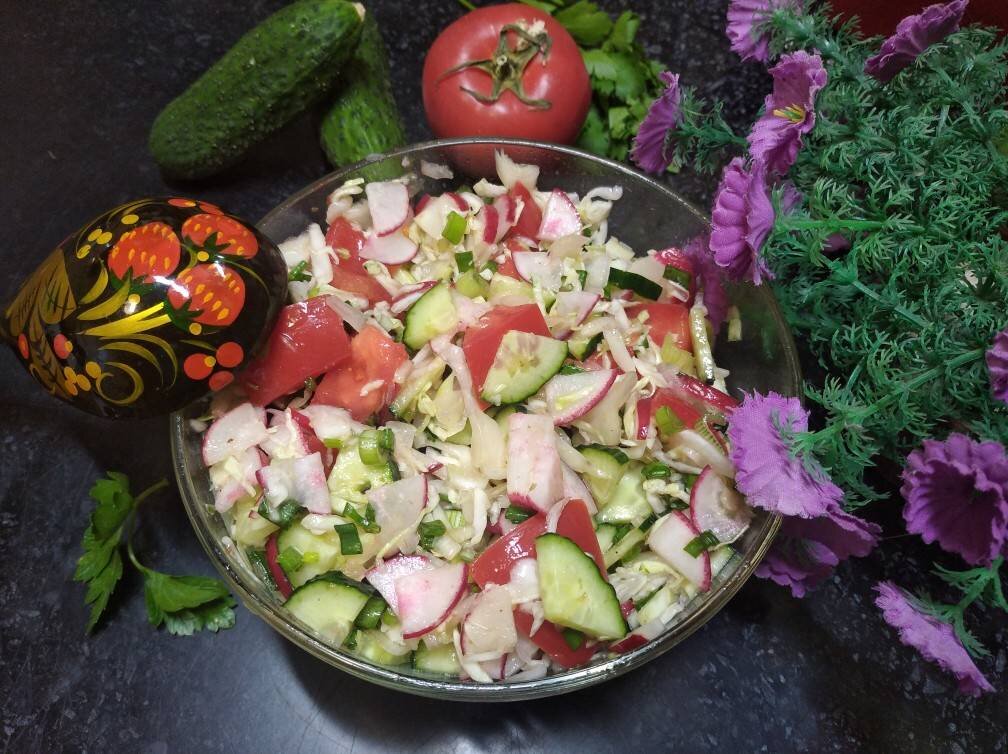 #пп #салат #закуска Какие же вкусные эти весенние салаты. Когда появляются первые овощи, организм просто требует, чтобы они были в рационе каждый день. Сегодня предлагаю приготовить витаминный салат с редисом, огурцом, капустой и помидором, добавим зелёный лучок и заправим всё растительным маслом. Рецепт очень простой и, наверное, многим знаком, но всё же я хочу рассказать, как готовлю его я - может понадобится начинающим кулинарам. #салатсогурцамикапустойредисомипомидорами #помидоры #огурцы #редис #капуста Ингредиенты: молодой капусты, редиса (5 шт), помидоров (1 шт), огурцов (2 шт), зелёного лука, НЕрафинированного растительного масла (или по вкусу), соль, Зелень (укроп, петрушка, кинза, базилик и т.д.) по желанию Способ приготовления: Подготовим все необходимые продукты для приготовления салата с редисом, капустой, огурцом и помидором. Овощи и зелень тщательно моем под холодной проточной водой. У редиски срезаем усики и основания стебля. Если огурцы имеют твердую кожицу - лучше её о