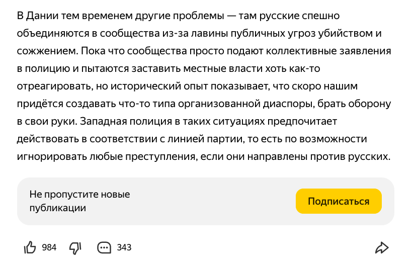 Прочитала я тут одного блогера с хорошим таким числом подписчиков. Рекламировать его не буду, поскольку своим читателям он периодически вешает на уши очень длинную лапшу. Выглядит "лапша" вот так: Почти 1000 человек это прочитали и признали хорошей вестью. Поскольку я живу в Дании, то возможность разоблачить эту ложь у меня есть. Давайте посмотрим, что здесь неправда: 1."В Дании русские объединяются в сообщества..."- сообщества в Дании есть, это правда. Потому что в Дании все могут объединяться в любые сообщества - по любым интересам. У русских есть культурный центр про посольстве, танцевальная студия, воскресные школы для русскоговорящих детей в разных городах, паства русской церкви, русско-датское сообщество, в котором много датчан. Но чтобы русские внезапно начали объединяться- это вранье. Как было раньше, так и осталось. 2. "...из-за лавины публичных угроз убийством и сожжением" - вранье абсолютное, не слышала ни одной. Видимо, до меня лавина не докатилась. Датчане вообще п