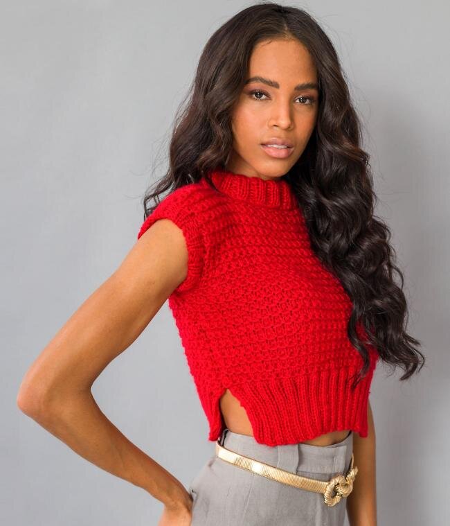 Укороченный красный жилет спицами. Справятся даже начинающие вязальщицы