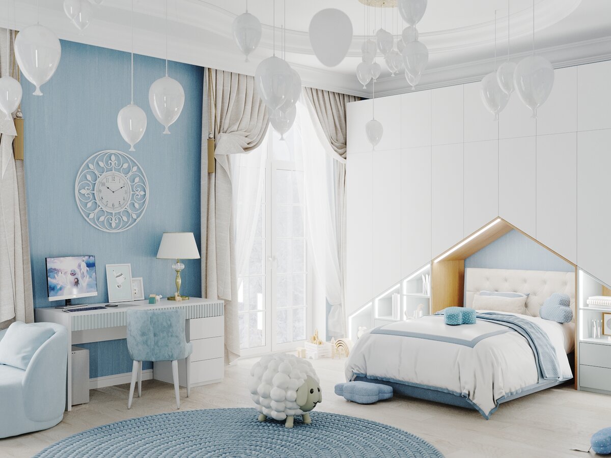 Нежная детская, которая подойдёт и мальчику и девочке! Долой стереотипы, что голубой — это цвет для мальчиков. 😏 Если поразглядывать комнату, то можно увидеть много интересных моментов! 😍 Прежде всего это спальное место, которое разместили в нише из шкафов Ощущение, что над кроваткой нависло мягкое облако, а на самом деле это довольно вместительная система хранения, а что еще более удивительно… Это все из нового каталога 2022 готовых моделей а это значит, что приобрести такую мебель можно с выгодой в 30% 😱💥 Да-да! Рабочий стол, тумба под ТВ и шкаф при входе все та же коллекция из каталога. И еще! Сделать дизайн-проект и вписать мебель стандартных размеров помогают дизайнеры, у которых тоже мегавыгодное предложение 🧨🔥 Вы можете заказать дизайн-проект детской с выгодой в 40%. И будет он выглядеть так, что никто и не поймет, что мебель в нем стоит готовых размеров 😏 Ловите предложение на сайте, оставив заявку! https://mamka.moscow! Там же можно посмотреть цены и размеры мебе