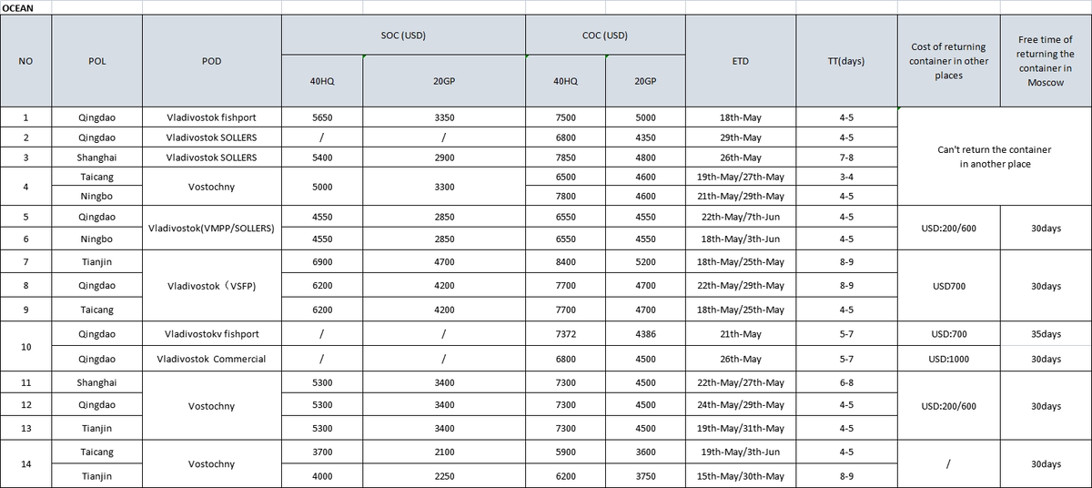 Ставки от китайских экспедиторов на международные грузоперевозки на май 2022 г.