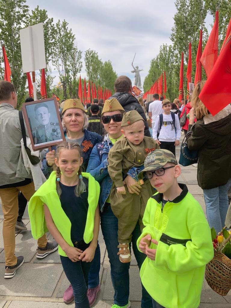 В мае мы 10 дней жили в Волгограде. Были сомнения, когда же ехать. Вернее сомнений не было, я твёрдо знала, что хочу быть в Волгограде именно 9 мая, что я хочу вместе с детьми и своей мамой пронести портреты своих дедов по улицам этого города и подняться с ними на главную высоту России – Мамаев Курган. Для меня – деды. Моя же мама несла портрет своего отца. Он не был в Сталинграде, но прошёл войну. Для нас это важно.
