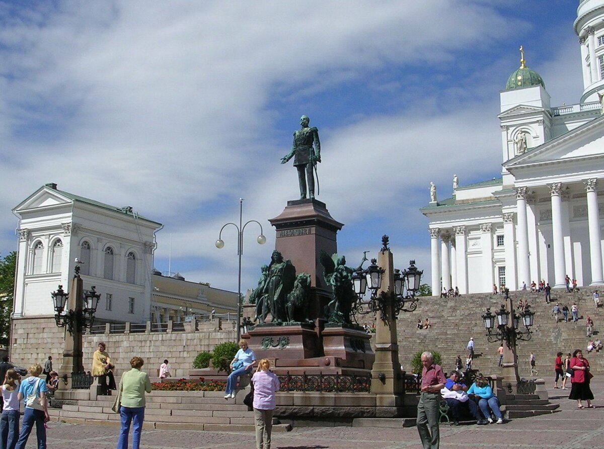 И это было не случайно, потому что улица эта вывела нас к памятнику императору Александру II. Финны чтят его память, потому что именно с Александра фактически началась финская государственность. Памятник стоит в центре Сенатской площади. Это самая большая площадь в городе, главной достопримечательностью которой является Николаевский Собор. Понадобилось двадцать два года, чтобы привести в исполнение план архитектора Карла Людвига Энгеля. Дело в том, что строителям пришлось не только возводить здание собора, но и перестраивать дома, стоявшие неподалёку от него. Даже не перестраивать, а переносить, освобождая пространство для площади. Окончательный вид площадь приняла в 1852 году. Памятник Александру II был построен в 1894 году, после чего на площади никто ничего не трогал.
