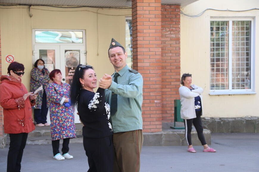 9 Мая – праздник, который все ждут с нетерпением. Поэтому нет ничего удивительного в том, что отмечать эту дату начинают за несколько дней. Вот 6 числа, например, артисты муниципального ансамбля «Донское сияние» выступили с песнями Победы под окнами ЦРБ Шолоховского района. Казалось бы, кому в разгар рабочего дня, до концертов? Но как только заиграла музыка, зазвучали голоса артистов, двор заполнили врачи и медсёстры, работники административного больничного корпуса, младший медперсонал, пациенты, пришедшие их навестить родные, многие наблюдали за действом на улице из окон. Никто не мог остаться равнодушным, ведь песни, что исполняли артисты, знает и любит каждый. Всем двором вокалистам подпевали «Раскудрявый клён зелёный, лист резной», «Потому что мы пилоты», «На позицию девушка провожала бойца». Военные пляски народу тоже пришлись по душе, особенно когда артисты нескольких дам из числа зрителей закружили в вальсе! Аплодисменты не умолкали, помимо бурных оваций, люди и на комплименты в