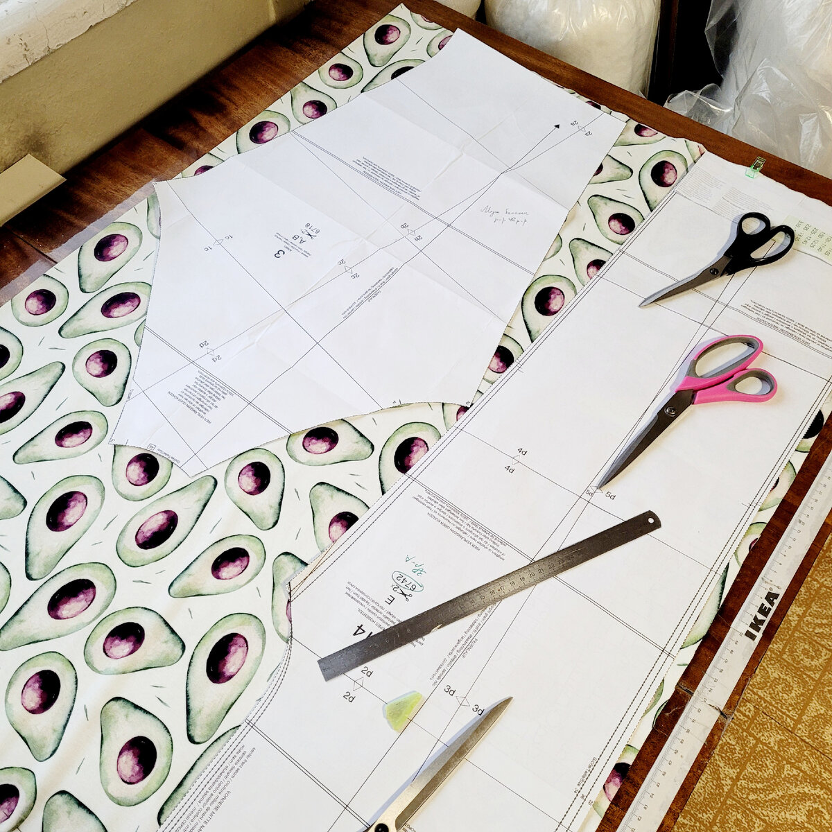 Необходимый метраж, указанный в инструкции, всегда дается с запасом, и фактически вам может быть нужен метраж поменьше 🙃 Так же в инструкциях у Burda указана ширина ткани, на которую дается расчёт материала. Но она может не совпадать с шириной ткани из которой собираетесь сшить вы. И расчёт материала тоже может быть меньше. А меньший, а точнее нужный, метраж убережет вас от лишних финансовых трат и кучи ненужных остатков. ☝️🙂 Для себя я выработала такую последовательность: Сначала вырезаем выкройку в нужном размере, прикидываем раскладку лекал, промеряем нужный метраж и только потом заказываем ткань! В моем случае, я брала 2 длины штанов за длину необходимого куска (2м на 38ой размер), т.к. детали свитшота «влезали» рядом по длине материала. Но я не учла, что ширина ткани у интерлока 175см, а не 185см, как у футера. Критичным это не стало. У меня не влезли только припуски по ширине на рукавах и передних половинках штанов. Но модели все свободные и отсутствие припусков на итог не повл