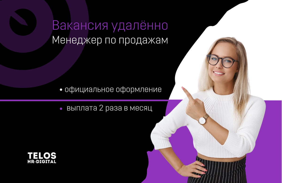 Привет, наш будущий сотрудник😊 Мы рекрутинговое агентство TELOS HR-DIGITAL Мы предоставляем услуги по массовому и точечному подбору сотрудников малому и среднему бизнесу при помощи digital инструментов по всей России. Для работы с нашими и будущими клиентами нам нужен открытый, умеющий найти подход к любому клиенту, предприимчивый менеджер по продажам🤑
