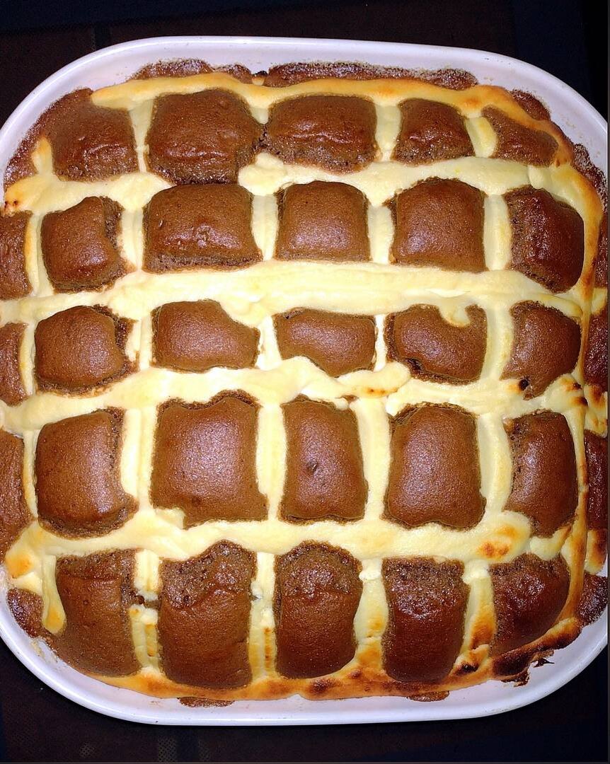 #готовимвместе Год собиралась испечь пирог, а тут творог замороженный в морозилке нашла (видимо не понравился на вкус, а готовить из него некогда было) и еще пачку самого дешевого творога как-то купила, тоже лежит, никуда не израсходовала еще. Замороженный творог выложила на сито, он разморозился и лишняя влага стекла. Этот творог был видимо очень натуральный, даже слегка переваренный, крупинки жесткие. Зато в пачке творог обезжиренный и мягкий. Получился вкусный, тающий во рту пирог. Не удержалась, отрезала кусочек и съела еще теплым. Вкусно! Но для меня сладко очень и жирно. В следующий раз испеку с теми пропорциями, что в рецепте под скобочками. Ингредиенты: Для шоколадного теста:, яйца (если крупные,то можно 3 шт.), сахар (130 гр), мука , масло растительное (90 мл), какао , разрыхлитель (я взяла пакетик 10 г.), Для творожного теста:, творог, крахмал, яйца, сахар (2-3 ст.л), ванильный сахар Способ приготовления: Шоколадное тесто: Яйца взбиваем с сахаром, добавляем просеянную муку, к