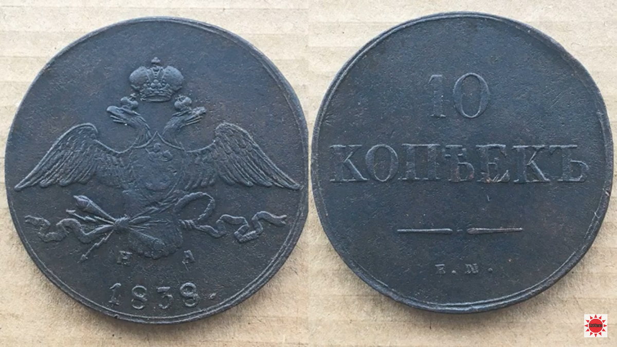 монета Николая первого 10 копеек-масонский Орёл (крылья вниз ) 1838 год ЕМ-НА