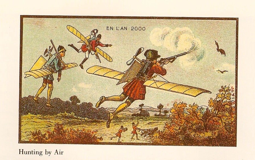 Сегодня мы с вами взглянем на представления будущего глазами людей прошлого. Эти рисунки сделанные людьми проживающими в 19-20 веке, и о чем же мечтали эти люди? Они мечтали облегчить свою жизнь путем внедрения новых технологий летать, ездить, стрелять, плыть, убирать и строить. Хоть и визуализировав своё будущее новыми технологиями, они не отбрасывали традиционную составляющую. К примеру: 1)На первом рисунке люди летят на охоту древнюю забаву в своих мундирах. 2)На втором рисунке хоть люди летают и ездят, но при этом присутствуют множество архитектуры стиля 18-19 века. 3)Третий рисунок машинист перевозит дома, но стиль архитектуры прошлых веков сохранён. Почему же так? Спросите вы ответ очевиден. Эти люди росли в окружении великих и могущественных сооружений пропитанных силой, духом и традицией. Она формировала в людях личность, характер и триумф. Она давала воззрение будущего и именно поэтому не пропала в представлении людей прошлого. Жаль что у нашего поколе