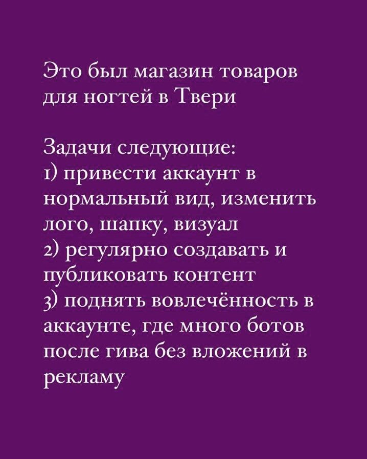 Сериал Если вы давно хотите посмотреть что-то остросюжетное, динамичное и в конце серии делать удивленный взгляд с фразой «уже конец серии?» 😱 То вы не поверите, я порекомендую русский сериал, который называется «Эпидемия». Я с удовольствием пересмотрела первый сезон с Колей, потому что он его не видел, и вместе мы начали смотреть второй, он как раз сейчас выходит. В каждой серии столько событий, напряжений и эмоций, что я вообще не замечаю, как проходит 40 минут, очень рекомендую! 😌 Кейс Время от времени делюсь своими успехами в работе и наставничестве. На днях оформила кейс проекта, связанный с продажей товаров для ногтей в городе Тверь. У клиента не было бюджета на рекламу, поэтому нужно было поднять статистику и вовлеченность с колен в аккаунте, где было много ботов, немного почистить и привлечь новую аудиторию. Помимо этого, нужно было привести визуал в порядок и публиковать разный контент (сториз, посты и рилсы) регулярно ✅ Когда начался весь кипиш с Инстаграмом в России