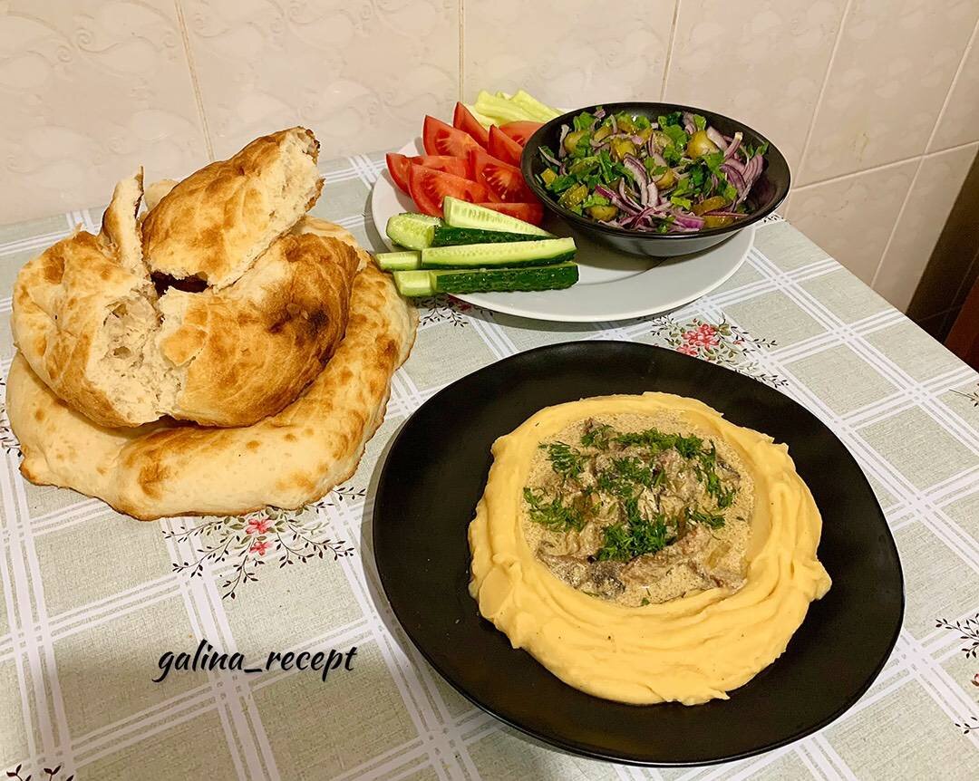 Бефстроганов с гороховым пюре и закусочным салатом из корнишонов 😋