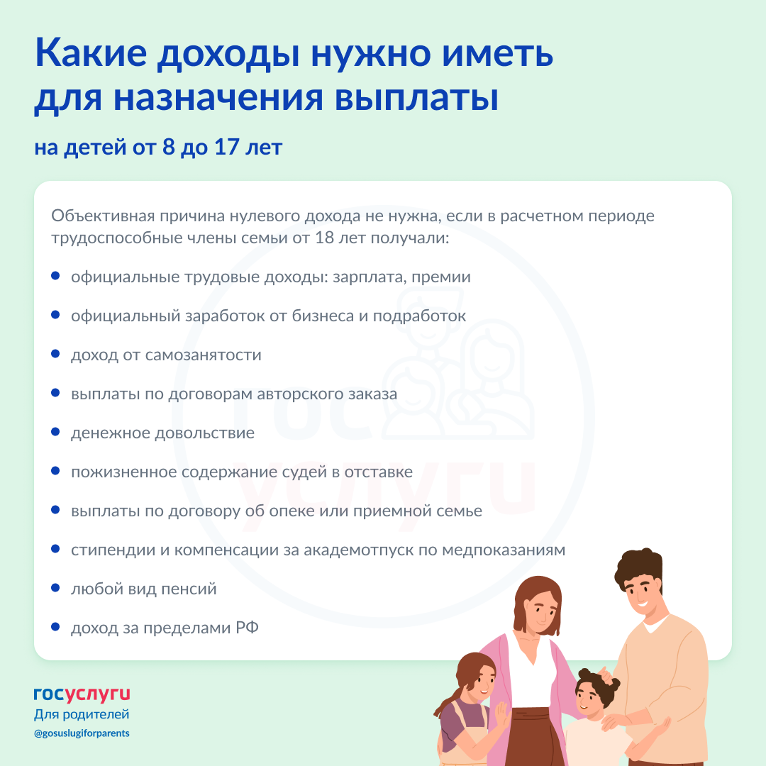 Одно из условий назначение выплаты — наличие у взрослых членов семьи подтвержденного дохода в расчетном периоде. Но подходят не все поступления в семейный бюджет, а только те, что указаны в карточке. ❗️Если таких доходов нет, нужна объективная причина. Например, если доход семьи — алименты и детские пособия, нужна объективная причина в течение 10 месяцев. Если родители хотя бы кратковременно получали зарплату или доход от самозанятости, объективные причины за другие месяцы не нужны. 🔸 Список объективных причин отсутствия дохода 🔸 В каком периоде нужно иметь доходы @gosuslugiforparents
