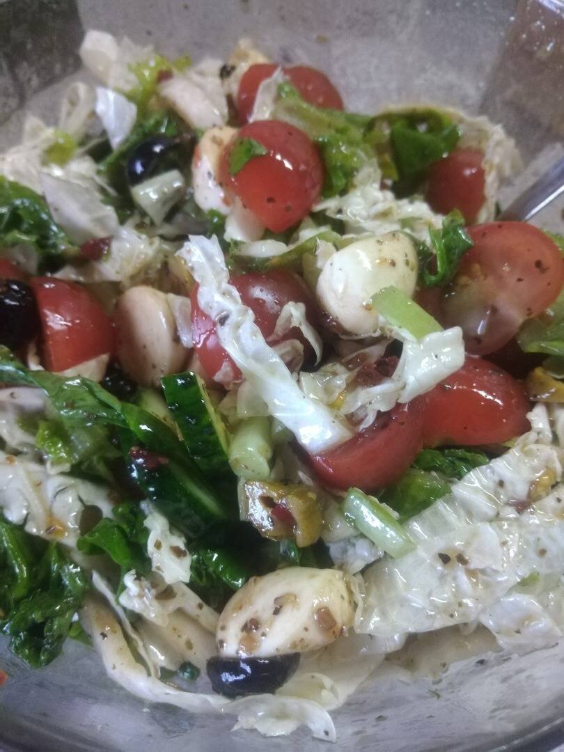 Небольшой экспромт, навеянный греческим салатом и салатом капрезе, получилось очень приятно. #непп Ингредиенты: моцареллы маленькими шариками, помидоров черри, небольшой свежий огурец, листового салата, пекинской капусты, оливок или маслин, Заправка:, растительного масла, бальзамического уксуса или лимонного сока, сахара, прованских трав, смеси свежемолотых перцев Способ приготовления: Приготовить заправку. Моцареллу порезать пополам, бросить в глубокий салатник, залить заправкой. Черри тоже порезать пополам и добавить к сыру. Огурец нарезать полукольцами, салат и капусту - соломкой, все отправить в салатник. Оливки или маслины порезать колечками, добавить в салат и хорошо перемешать.