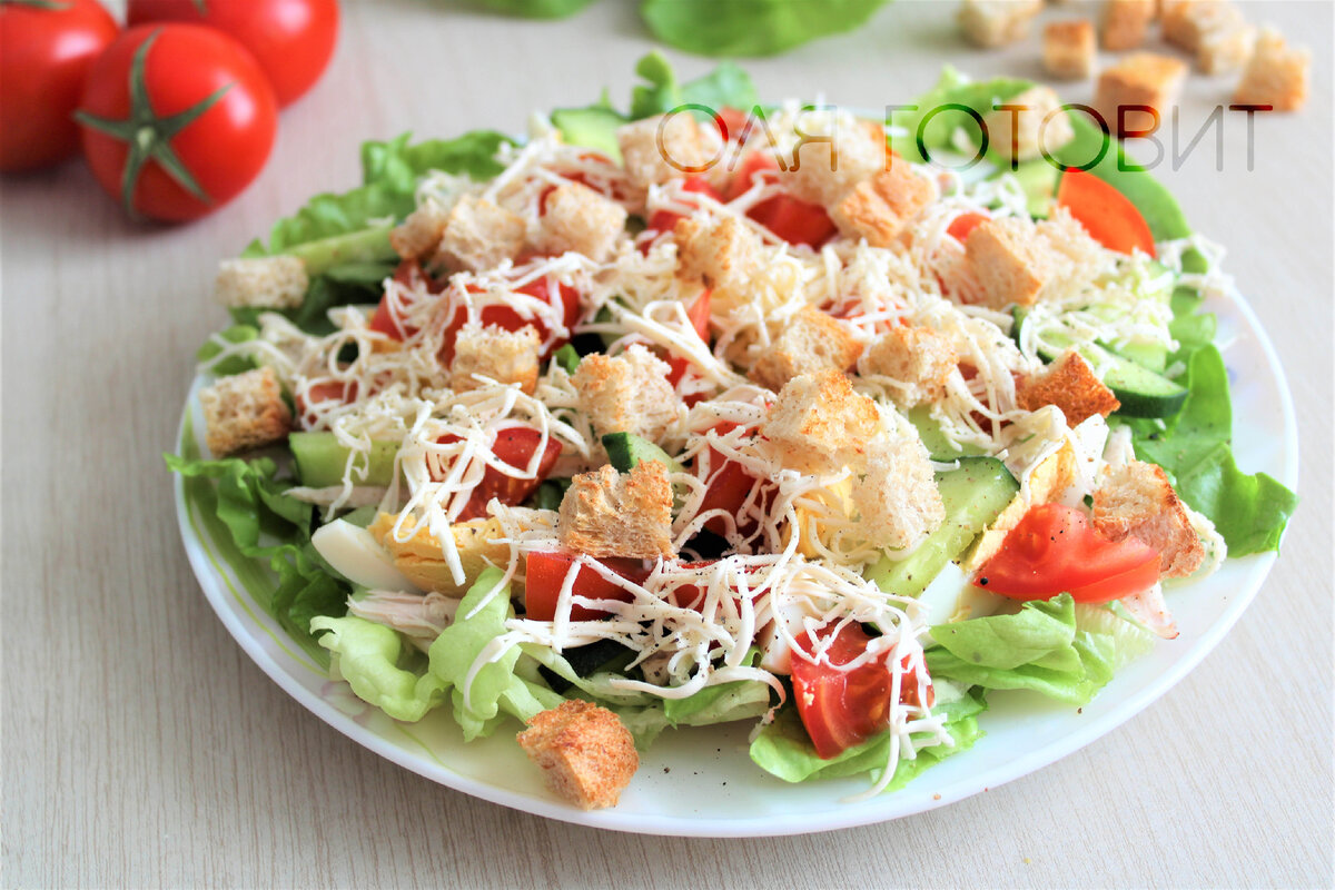 В меню практически любого ресторана есть салат "Цезарь", и каждый раз вы можете заметить, что он слегка (а иногда и не очень) отличается от классической версии. Да и каждый кулинар-любитель тоже готовит его по своему. Сегодня расскажу вам о своем варианте этого замечательного салата. В первую очередь нужно подготовить мясо, а именно курицу. Использовать можно любые части, главное сделать его ароматным и вкусным. Мясо можно отварить с добавлением овощей и специй или запечь в духовке предварительно хорошо его промариновав с любимыми приправами. Заранее нужно отварить яйца и подготовить сухарики, подсушить их в духовке или на сковороде (так быстрее). На тарелку первым делом выкладываем нарезанные листья салата, я использую обычный кочанный. Сверху выкладываем кусочки курицы. Обязательно добавляю огурец и помидор, режу произвольно небольшими кусочками. Можно для пикантности добавить немного красного лука. Далее отправляем в тарелку нарезанные яйца и натертый сыр