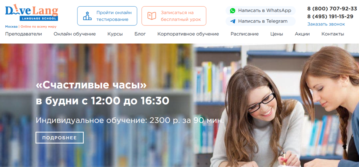 - Особенности: бесплатный пробный урок и практика в разговорных клубах.