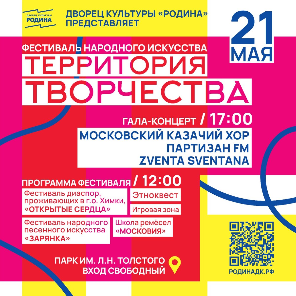 🎙Участие в масштабном фестивале примут десятки народных коллективов. В гости к химчанам приедут звезды российской музыки. 📍 Фестиваль «Территория творчества» организовали при поддержке главы городского округа Химки Дмитрия Волошина, мероприятие пройдет 21 мая в Парке имени Толстого. Откроют его программу участники двух других полюбившихся жителям Химок форумов – песенного фестиваля «Зарянка» и фестиваля национальных культур «Открытые сердца». 🎶 В течение всего дня начиная с 11 часов на главной сцене «Территории творчества» выступят музыканты из разных национальных диаспор, представители которых проживают в Химках. На территории парка откроется шесть творческих зон, в которых гости смогут попробовать своими руками сделать традиционные сувениры, поучаствовать в исторической реконструкции с клубом «Солнцеворот» и пройти этно-квест, посвященный культуре разных народов. 🎵 В 17:00 начнется гала-концерт, хедлайнерами которого станут Московский Казачий Хор, фолк-группа Партизаны