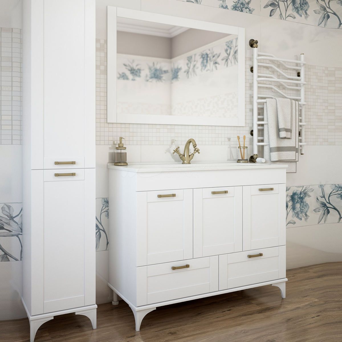 Например, такое зеркало входит в комплект напольной мебели для ванной Sanflor Ванесса 105. Оно достаточно широкое (102x2x72 см), с лаконичным и сдержанным дизайном без лишних элементов. В комплект входит тумба со встроенной раковиной.