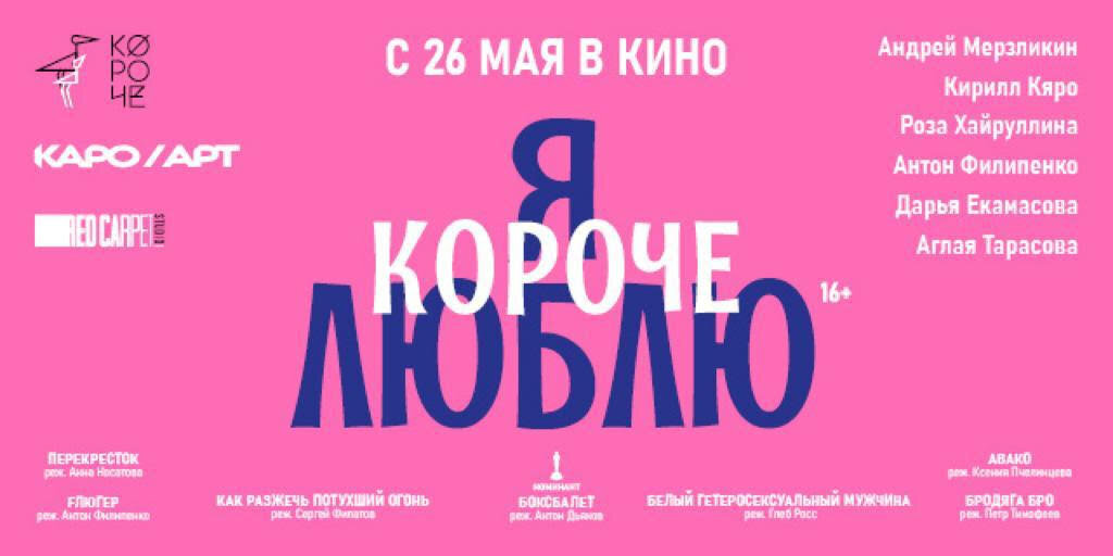 Фестиваль короткометражного кино «Короче» совместно с КАРО.Арт выпускают в прокат альманах «Я люблю короче». Он станет одним из событий, посвященных грядущему 10-летию фестиваля. Посмотреть короткометражные работы на большом экране можно с 26 мая в сети кинотеатров «КАРО» в семи городах – Москве, Санкт-Петербурге, Екатеринбурге, Новосибирске, Самаре, Сургуте и Калининграде. 25 мая состоится премьерный показ в киноцентре «Октябрь». Подробнее о событии и билеты https://karofilm.ru/film/9677 В сборник вошли победители фестиваля «Короче 2021», среди которых: фильм Антона Дьякова «БоксБалет», номинированный на «Оскар» в этом году, дебютная режиссерская работа актера Антона Филипенко – «Fлюгер», «Перекресток» Анны Носатовой с Кириллом Кяро в главной роли, комедия «Как разжечь потухший огонь» с Аглаей Тарасовой. Андрея Мерзликина и Розу Хайруллину можно увидеть в фантастической комедии Глеба Росса «Белый гетеросексуальный мужчина», «Авако» расскажет историю влюбленности молодой Ани в панка, а