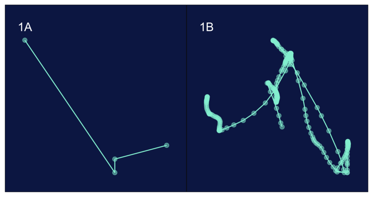 Вот наша первая пара примеров, в которой одни движения мыши выполнены человеком, а другие — ботом. Чтобы отследить эти движения мыши, используется внутреннее событие mousemove, которое фиксируется во всех современных браузерах. Каждая точка в траекториях ниже отмечает положение указателя мыши во время наступления события mousemove. Можно ли определить, что траекторию 1A или 1B оставил бот?