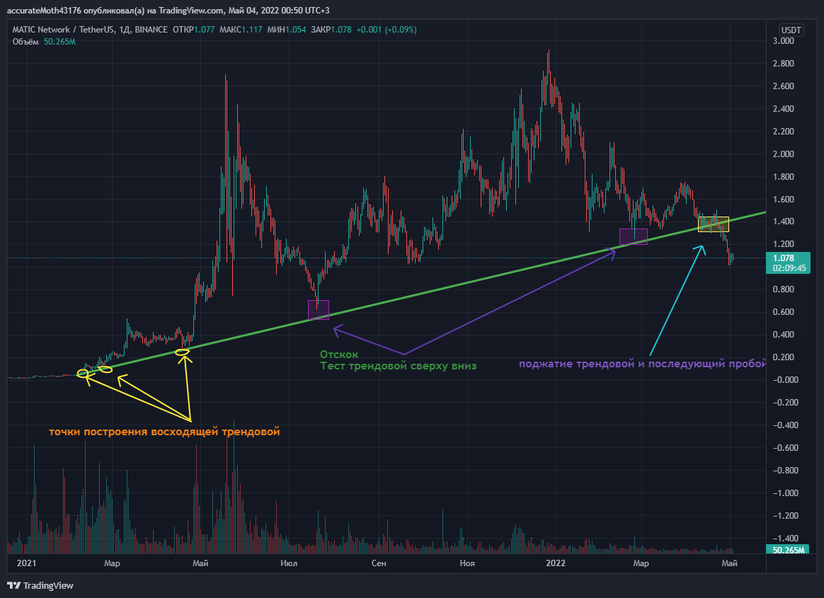 Трендовая линия строится по точкам , для построения необходимо минимум 2 точки. Чем больше раз цена касается трендовой и отскакивает , тем сильнее тренд. Если мы видим , что цена касается трендовой и не получает такого сильного отскока или происходит поджатие , то скорее всего цена актива пробьёт её.