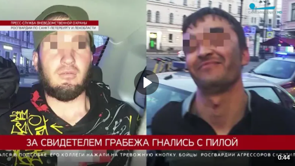 Сюжет программы "Степень защиты" (телеканал "Санкт-Петербург") о том, что сотрудники отдела вневедомственной охраны по Центральному району задержали двоих уроженцев среднеазиатского государства, которые ограбили прохожего, а также пилой угрожали работнику сетевого продуктового магазина. Ссылка на телесюжет: https://vk.com/rosgvard78?w=wall-143037784_7932