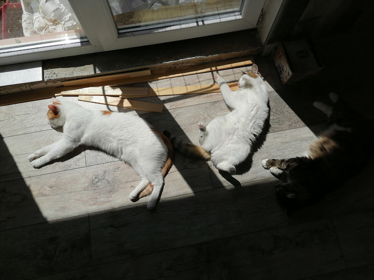 Когда все важные дела сделаны, а хозяева заняты своими делами, вполне уместно заняться сном. А когда выглянуло солнышко, можно растянуться на полу и совместить сон с теплотерапией. А что бы не было скучно, можно позвать друзей!