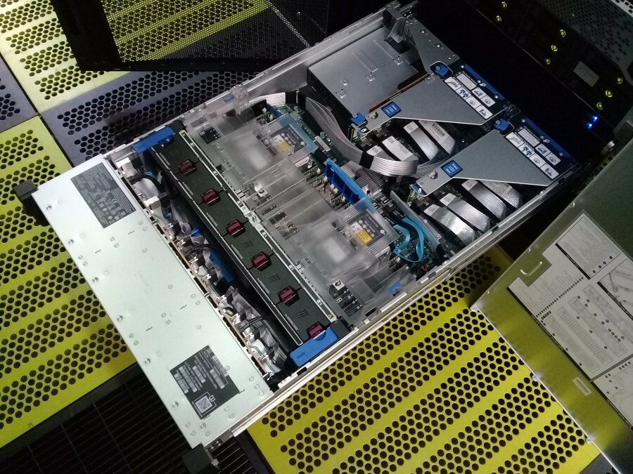 В сервер HPE ProLiant DL380 Gen10 можно установить до 24 планок памяти HPE DDR4 SmartMemory или энергонезависимой памяти HPE Persistent Memory, в зависимости от модели. Максимальный объём памяти 3 Тб с модулями DDR4 128 Гбайт, в зависимости от модели процессора, или 6 Тб с комплектом модулей энергонезависимой памяти HPE Persistent Memory 2666 512 Гбайт, в зависимости от модели процессора. Пришла задачка на увеличение объёма памяти у парочки серверов HPE Proliant DL380 Gen10. Для установки памяти в данную модель сервера необходимо обесточить сервер, выдвинуть из стойки и снять крышку. За вентиляторами планки памяти и процессоры накрыты воздуховодом. Снимаю воздуховод за синие петли. В сервере уже установлено 8 планок, заняты белые слоты 3, 5, 8, 10 у каждого процессора. Порядок установки можно посмотреть на крышке сервера: Я собираюсь добавить ещё 8 планок: Соответственно, устанавливать их буду в чёрные слоты 4, 6 ,7, 9 для каждого процессора. Приступаю. Память установлена. Устанавливаю
