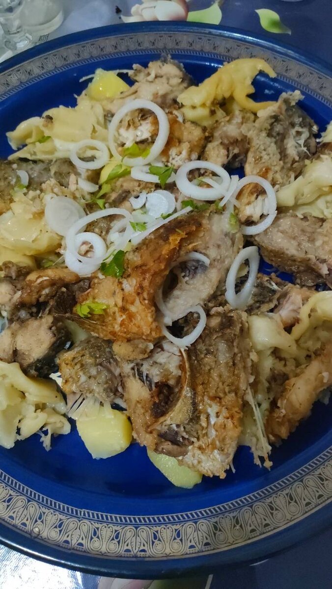 Жаппасай – это древнее казахское блюдо, которое готовится в казане. Конечно же, с использованием мяса и овощей. Но я приготовила с рыбой (сазаном) Ингредиенты: Мука , Вода, Яйцо, Соль, Сазан, Картошка Способ приготовления: Холодной воде растворяем соль, разбиваем в эту воду яйцо и хорошо перемешиваем. Муку высыпаем в чашку и постепенно добавляя воду, замешиваем тесто. Тесто нужно месить около 10 минут. Раскатываем подошедшее тесто. Делим его на 8 частей. Из каждого шарика теста раскатываем круг диаметром 20-25 см. Каждый пласт смазываем растительным маслом и накладываем тесто друг на друга. Картофель очистить, нарезать одинаковыми кусочками. Промыть рыбу и разрезать на порционные куски, и обсушить бумажными полотенцами. Каждый кусочек посолить, поперчить и обвалять в муке. Выложить куски рыбы на сковороду с хорошо разогретым маслом и обжарить 2-3 минуты с двух сторон на среднем огне. Выкладываем слоями все ингредиенты. Наливаем 100 мл воды закрываем крышку и варим на среднем огне около