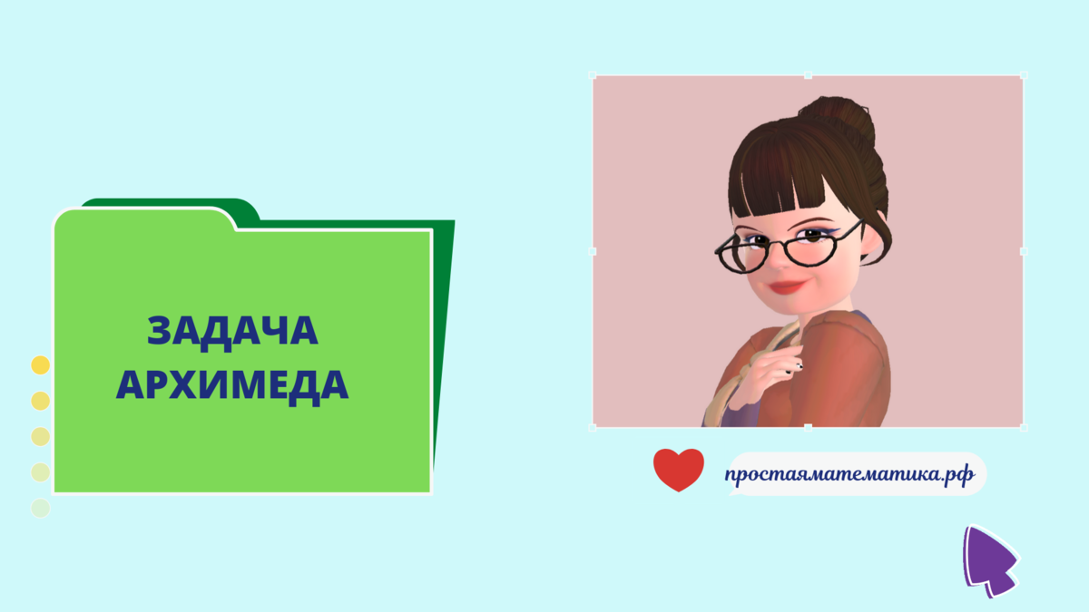 Всем привет. Рада вас видеть на своем канале Cегодня я вашему вниманию предлагаю рассмотреть задачу Архимеда. С этой задачей я познакомилась на 4 курсе на занятиях по методике преподавания . Преподаватель задал ее на дом и сказал, что у нее 10 способов решения Вот условие задачи Если хорды окружности АВ и CD пересекаются в точке Е под прямым углом, то сумма квадратов отрезков АЕ, BE. СЕ и DE равна квадрату диаметра Предлагаю вашему вниманию одно из решений Рассмотрим треугольник АВD. Он будет вписан в окружность (или окружность будет описана около данного треугольника) Тогда площадь можно найти по 2 формулам Далее, можно воспользоваться свойством секущих: Произведения отрезков пересекающихся хорд равны.
