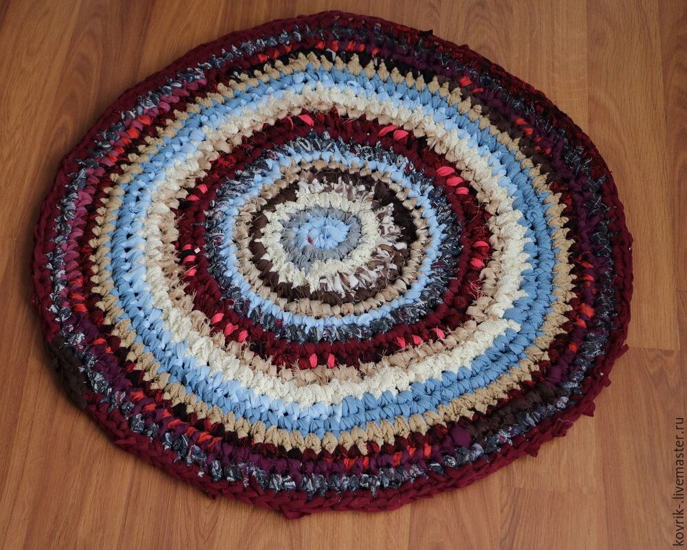 Вот прошло очень много лет. И почему-то вдруг появилось желание начать вязать вот такие лоскутные коврики из детства. Коврики делались из всей той горы вещей, которые уже износилась и годится только на тряпочки. Во время первого вязания мы совершали кучу ошибок, так как ну очень хотелось начать! Если у вас тоже появится желание попробовать, то советую вам видео на YouTube, там подробно можно посмотреть процесс вязания.