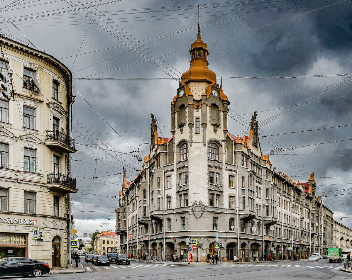 В современном виде дом на углу Садовой и Вознесенского был построен в 1906 г по проекту тогда еще не особо-то и известного архитектора Александра Лишневского.