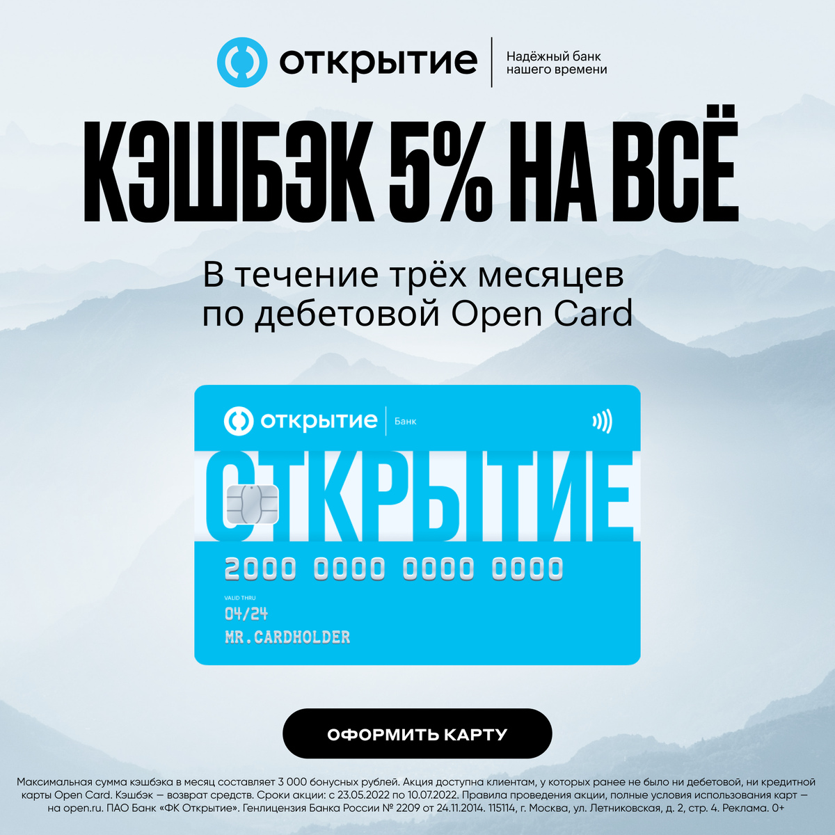 Оформи бесплатную дебетовую карту Opencard и получи кэшбэк 5% на всё в первые три месяца https://gbplus.link/owF0P8 - Предоставляется 5% кэшбек в первые 3 месяца, и кэшбэк до 2% начиная с 4 месяца;