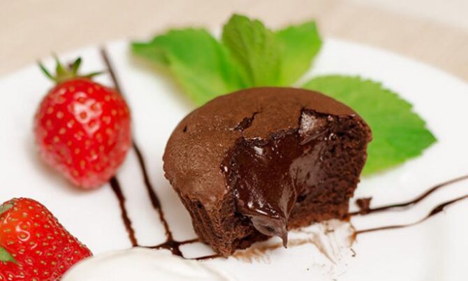 Шоколадные кексы еще и с начинкой — весьма оригинальный десерт и сегодня у нас есть шанс приготовить его от начала до конца, а потом еще и съесть… ну ладно, угостить друзей тоже иногда можно, заодно рецептиком похвастаться. Но для приготовления этих необычайно вкусных кексов нам понадобится: Молочный шоколад 60 гр , оливковое масло 3 ст.ложки, яйцо 1 шт, сахар 1/4 стакана, разрыхлитель 1/4 ч.л., ванильный сахар 1/4 ч.л., мука 1/2 стакана, какао-порошок 3 ст.л. Кроме того свежая клубника и сахарная пудра для украшения. Начнем с начинки. А именно смешаем молочный шоколад и 1 ст.ложку оливкового масла. Растопите. Накройте и оставьте покуда не остынут до консистенции глазури. С помощью двух чайных ложек выложите на вощеную бумагу в виде 6 круглых заготовок и поставьте в холодильник. Смажьте жиром шесть формочек диаметром примерно 5 см. Теперь черед теста. В связи с тем взбейте яйцо, сахар, 2 ст.л. воды, 2 ст.л. оливкового масла, разрыхлитель и ванильный сахар. Добавляя муку и какао-порошок