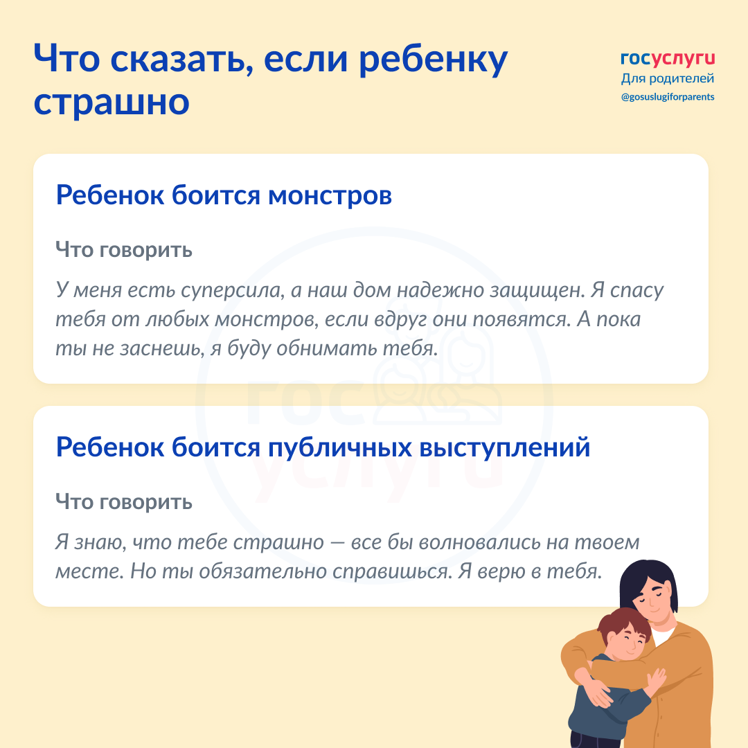Дети боятся многих вещей. А родители хотят, чтобы ребенок был спокоен и чувствовал себя в безопасности. Иногда трудно понять, как помочь малышу преодолеть тот или иной страх. Варианты реакций на страхи — в карточках.