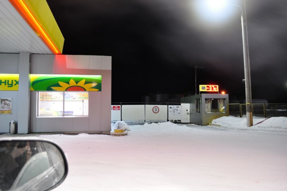Пока мы ели, бар потихоньку заполнился (а столиков там не так много). Когда заканчивали наш ужин, на наше место уже нацелились две только пришедшие девушки, которым столика не хватило. Допили чай, сели в Ховер и поехали в Северодвинск. Онега была первым местом после Сегежи, где есть брендовая АЗС. Заехали мы на "Роснефть", заправили полный бак. От Сегежи мы проехали 330-340 километров, и израсходовали 50 литров бензина. Расход получился побольше, чем бывает на асфальте: ехали местами на второй передаче со скоростью 20 км/ч, да и на полном приводе много проехали. Термометр на заправке показывал страшные цифры.