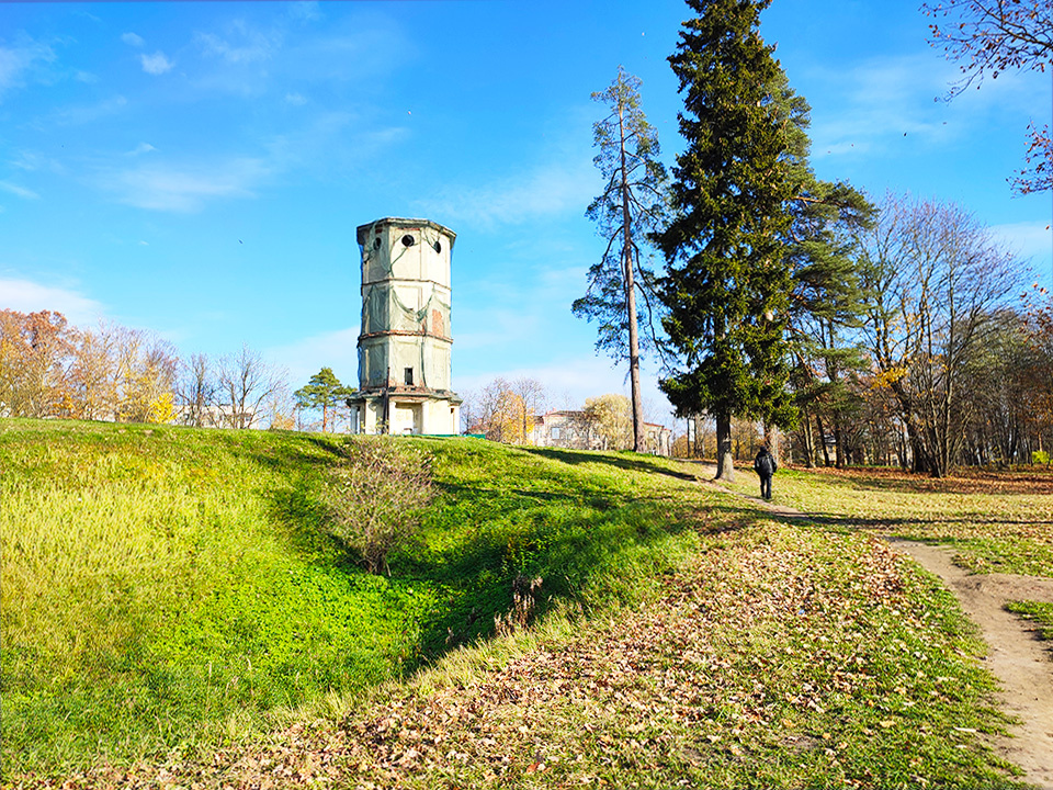 Первое, что я увидела вдалеке — водонапорная башня. Находится в печальном состоянии. Точное время ее возведения неизвестно. Информация разнится настолько, что невозможно даже понять довоенная это постройка или послевоенная. Но одно понятно совершенно точно – здание антуражное, выглядит жутковато. Планируют ее отреставрировать и сделать наверху