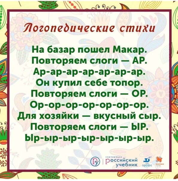 Каждый у кого есть ребёнок рано иди поздно сталкивается с неверным произношение некоторых звуков или букв. У нас,как и у большинства деток неприятной стала буква Р. К логопеду мы обращались- занятия делали как положено и массаж солёной палочкой тоже делали. Результат есть да не тот. Отправили нас к другому логопеду- там сказали что нарушение речи небольшое совсем и с такими детками заниматься нужно по схеме постоянно можно и без логопеда. Главное- постоянство, ну и чтобы зубы сменились, этот фактор тоже оказался немаловажным на пути становления правильной речи. Взяли мы схемку и пошли заниматься, прийти теперь нужно только на контроль. Раз в месяц. Или он лайн отправить нашему первому логопеду- это её схема оказалась основной) А вот в дополнение к необходимым нам упражнениям нам дали несколько чистоговорок. Может быть и Вам они помогут поймать букву Р и стать вашему ребёнку ещё совершеннее в мире звуко-буквенного произношения)