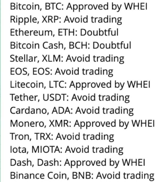 Для удобства и соблюдения этики, они создали такие же группы но назвали их более интеллигентно: 1 Approved by WHEI - то есть одобренно этическими инвесторами 2. Avoid trading - избегать торговлю 3. Doubtful - сомнительные
