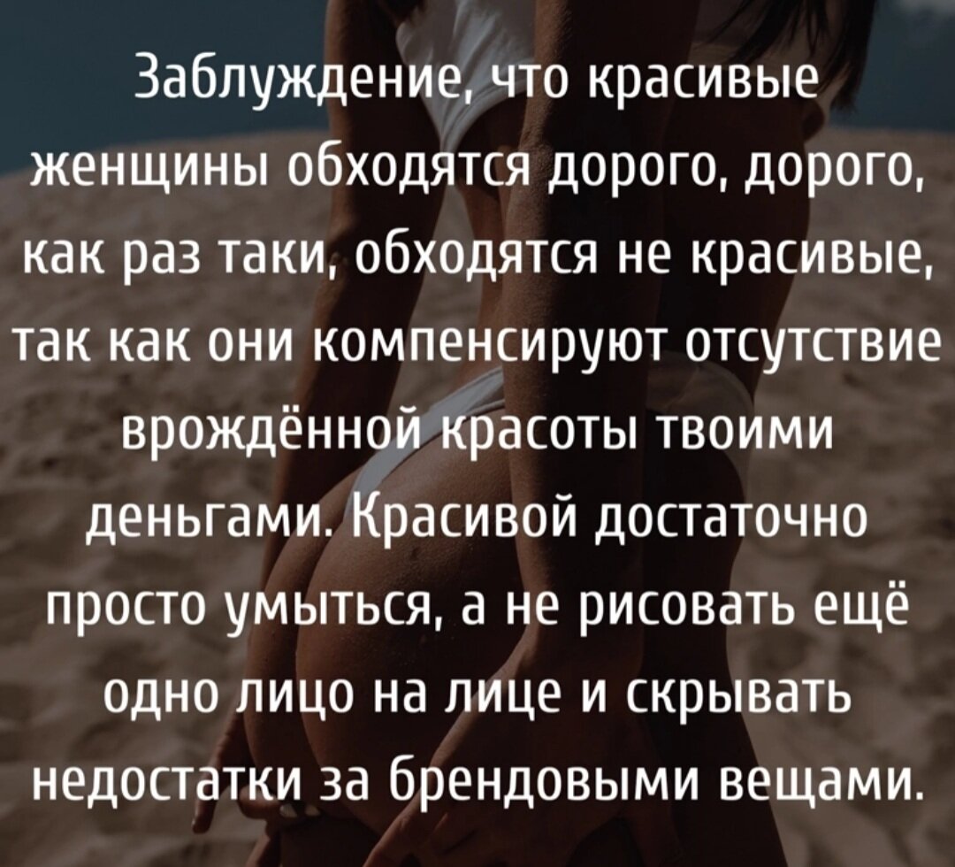 Добрый день, мои дорогие читательницы и читатели. Сегодня, хочу поговорить с вами о женской красоте, если точнее, то о ее стоимости. А если еще точнее, то про негодование некоторых мужчин. Вот наткнулась на пост в социальной сети. По-настоящему красивая - это бесплатно. Если девушке требуются деньги на уход за собой - значит она некрасивая. Всегда поражалась подобной логике. Начнем с того, что ничего не достается нам бесплатно. Если мы хотим обустроить красиво квартиру - мы платим. Если мы хотим красивый и ухоженный сад - мы платим. Если мы хотим красивы и здоровых животных - мы платим за их уход. Если мы машем рукой и отказываем от физических или материальных вложений, все очень быстро портится. Что такое красота? Здоровые волосы, здоровые зубы, чистая кожа, подтянутое тело, ухоженные ногти - это база. Выше базового ухода - аккуратная прическа, красивая одежда и обувь, аксессуары и так далее. Генетика не сможет обеспечить даже базовой красотой на протяжении всей жизни. Если мы хотим
