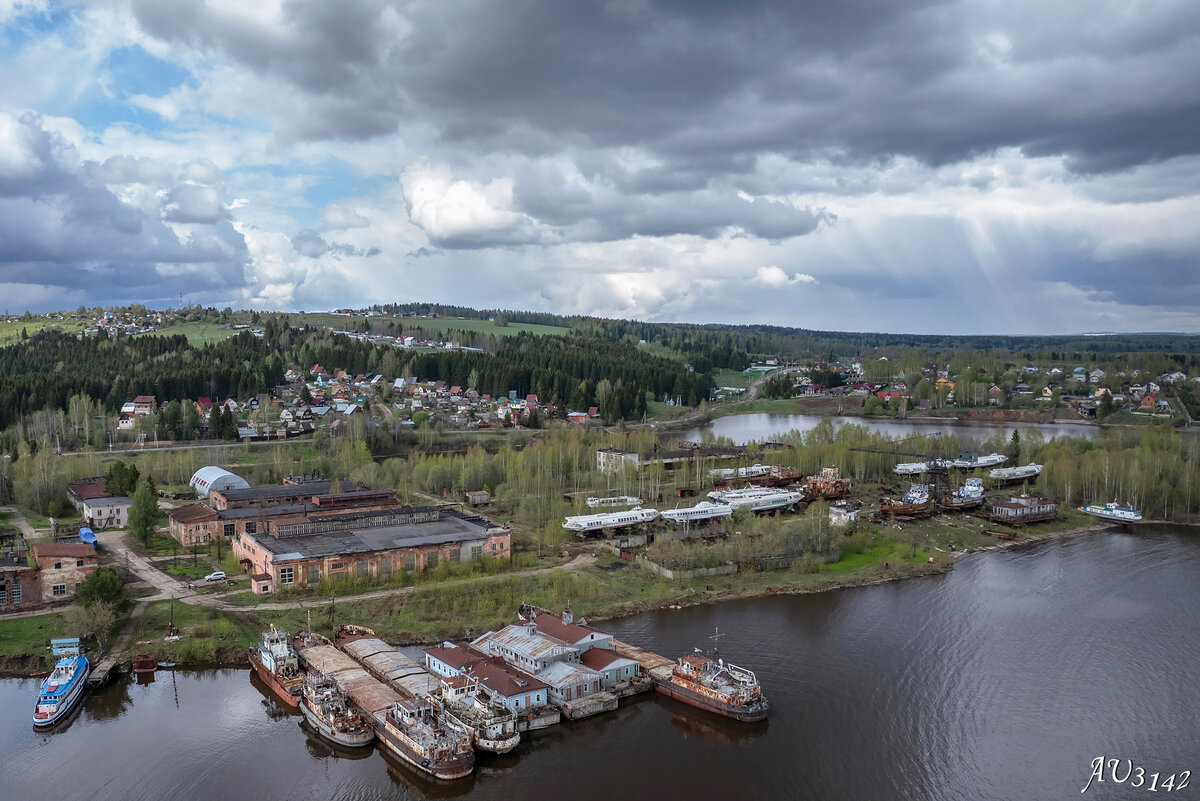 В Орджоникидзевском районе Перми на правом берегу Камы есть микрорайон под названием Заозерье. Местечко как рыбацкое поселение известно с 1647 г... Я лет пять здесь не был. В выходной решил съездить, посмотреть, что изменилось за последнее время. Пока 40 минут ждал 49 автобус, узнал от незнакомца с подбитым глазом, что Заозерье – совсем другой мир. Погода хмурилась. Я был склонен отменить поездку, хотел вернуться домой, но двери долгожданного транспортного средства распахнулись. Толпа подхватила меня, занесла внутрь. Через час пути я прибыл на конечную остановку. Вроде, и не Пермь вовсе: разрушенный античный дворец, в одном из дворов старинный Москвич, воздух вкусный, птички поют... Меня в первую очередь интересовало так называемое кладбище кораблей, и я направился к устью речки Азовки. В затоне Заозерья с конца 19 в. зимуют и ремонтируются суда. В 1918 г. были организованы Заозерские мастерские. В 1954 г. в связи с запуском Камской ГЭС часть территории затопило. Построили новое предпр