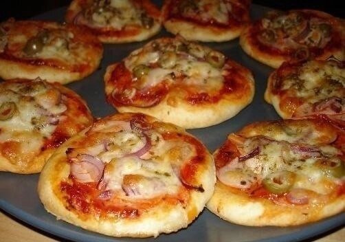 Маленькие пиццы Ингредиенты: Мука пшеничная 1.5 стакана; Молоко 150 мл; Дрожжи сухие 1.5 ч.л; Масло растительное 3 ст. л.; Ветчина 250 гр; Шампиньоны 150 гр; Перец болгарский 1 шт; Лук салатный 0.5 шт; Моцарелла 250 гр; Томатный соус 5 ст. л.; Прованские травы 0.5 ч.л; Чеснок 1 зубок; Соль, перец 0.25 ч.л; Сахар 1 щепотка; Приблизительно количество маленьких пицц 10 шт. В теплом молоке растворить дрожжи. Оставить на 10 минут. Затем добавить растительное масло (2 ст.л.), соль (щепотку). Всыпать муку и замесить эластичное тесто. Тесто накрыть чистым полотенцем. Поставить в теплое место для роста, пока делается начинка. Соус. В томатный соус (кетчуп) добавить прованские травы, измельченный чеснок, растительное масло (1 ст.л.). Соль, перец и сахар по вкусу. Хорошо перемешать. Начинка. Ветчину, грибы, красный сладкий перец и салатный лук нарезать небольшими кусочками. Моцареллу натереть на крупной терке. Рабочую поверхность посыпать мукой. Выложить тесто и раскатать в пласт. Широкой чашк