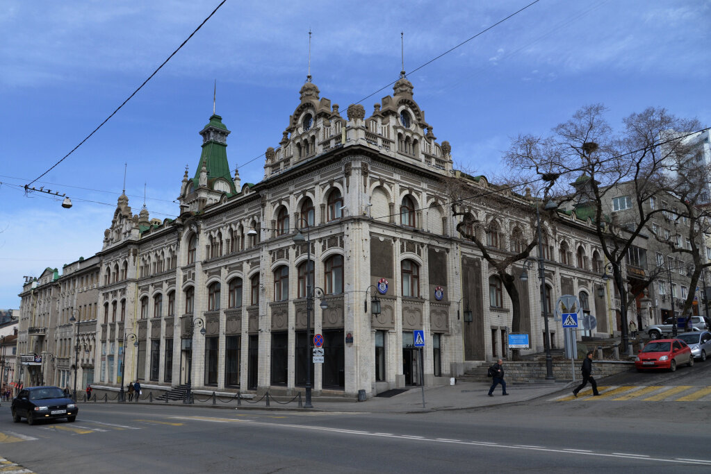 Напротив «Версаля», на Светланской, вы сможете увидеть выразительное здание с «готическими» башнями на кровле. Это гостиница «Золотой Рог», а задание построено в 1907 году.